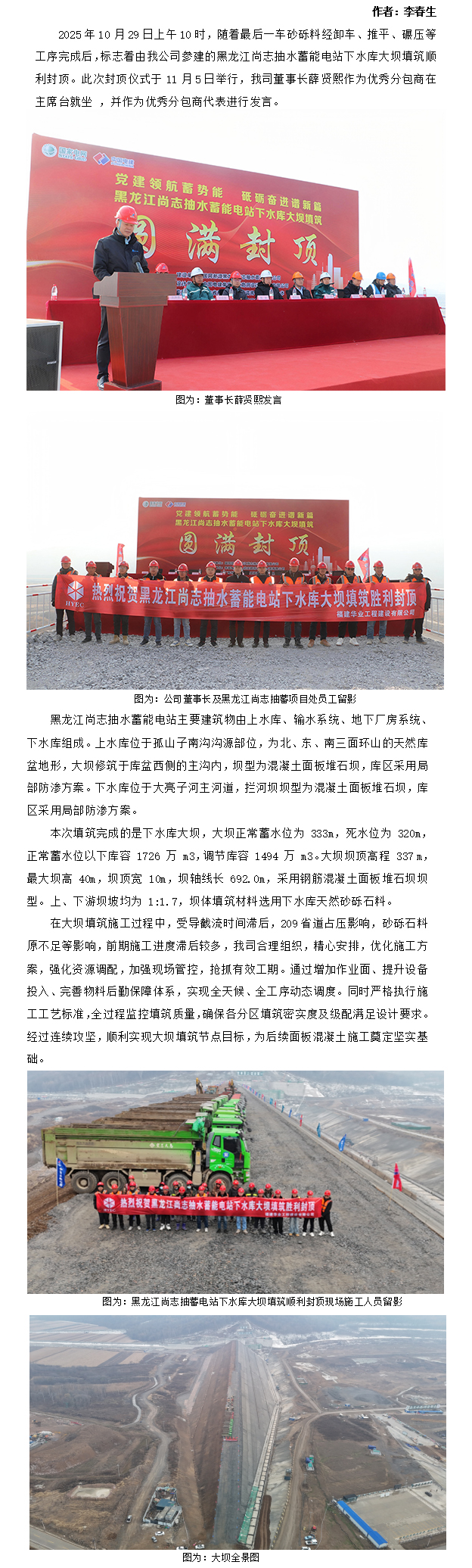 黑龙江尚志抽水蓄能电站下水库大坝填筑顺利封顶
